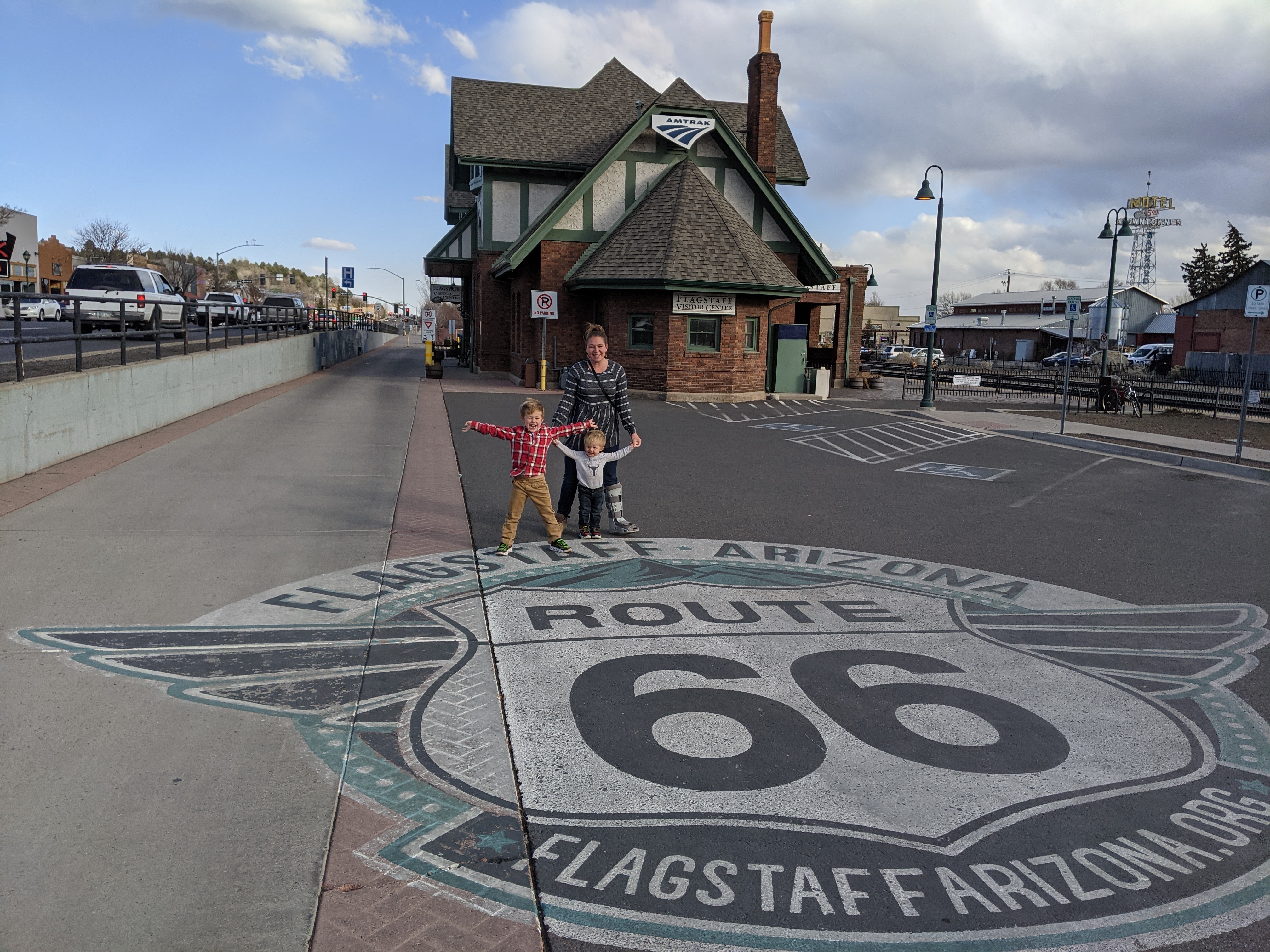 With fresh coffee and hot cocoa for the kids, we headed to the city park. The kids played and played beneath the tall pines. The wind whispering through the trees, as we chased and laughed. It was a relaxing break. We made our way through the city. We checked out the tourism center where there is an Amtrak train stop and a sign for Route 66.