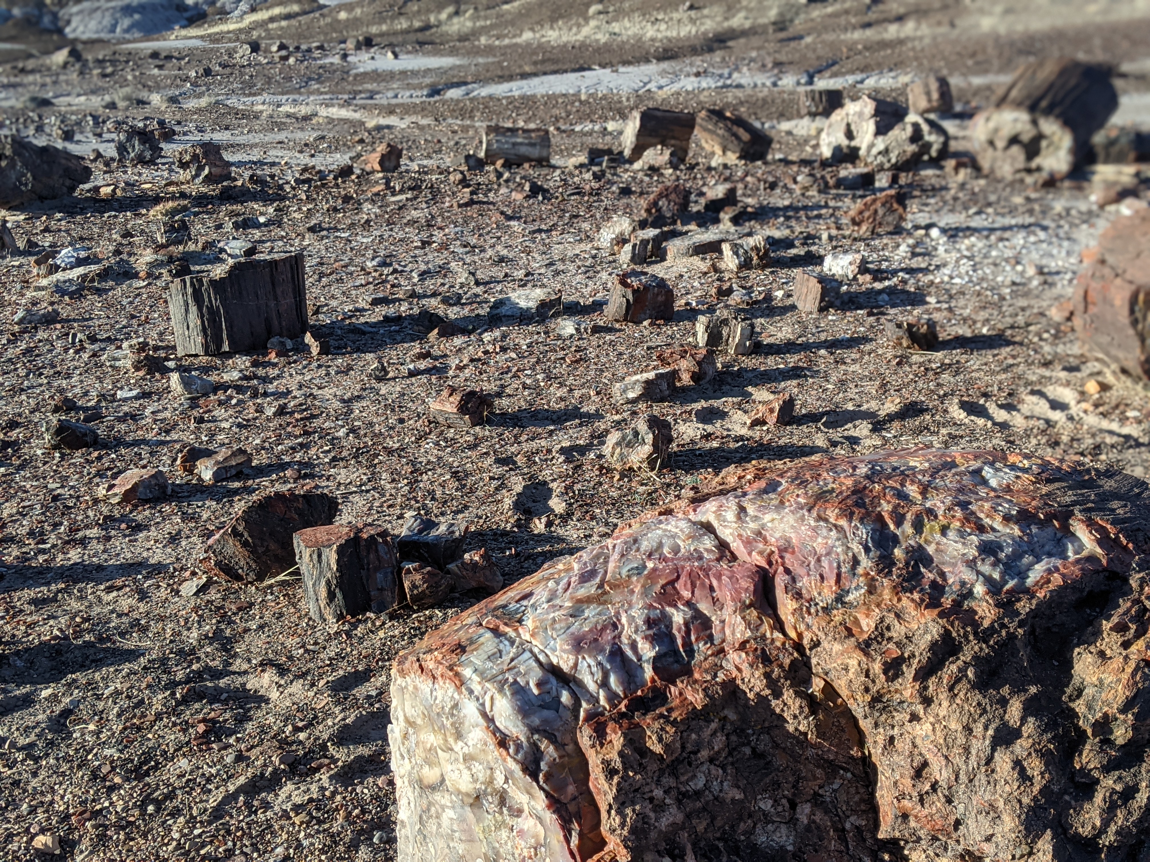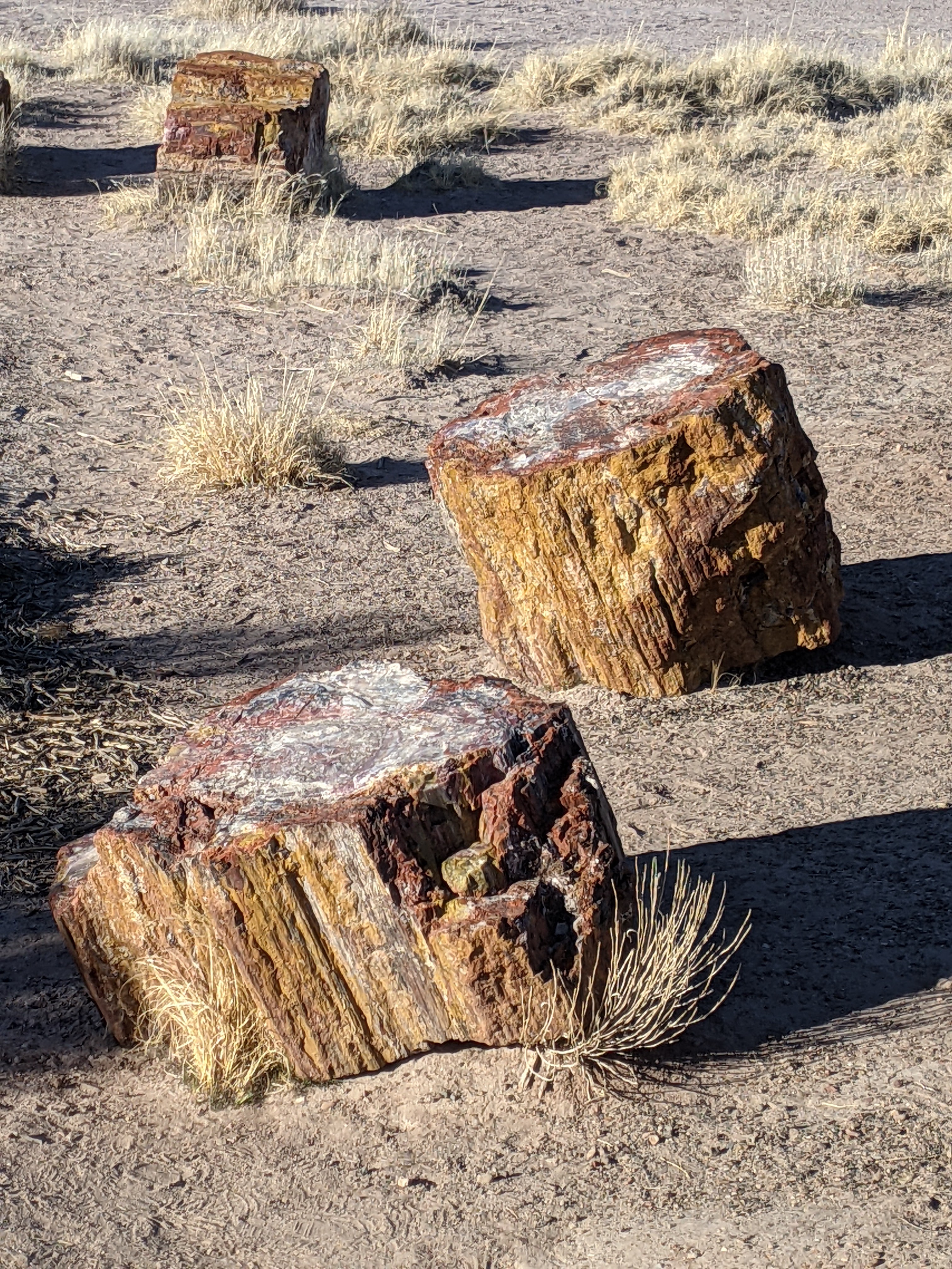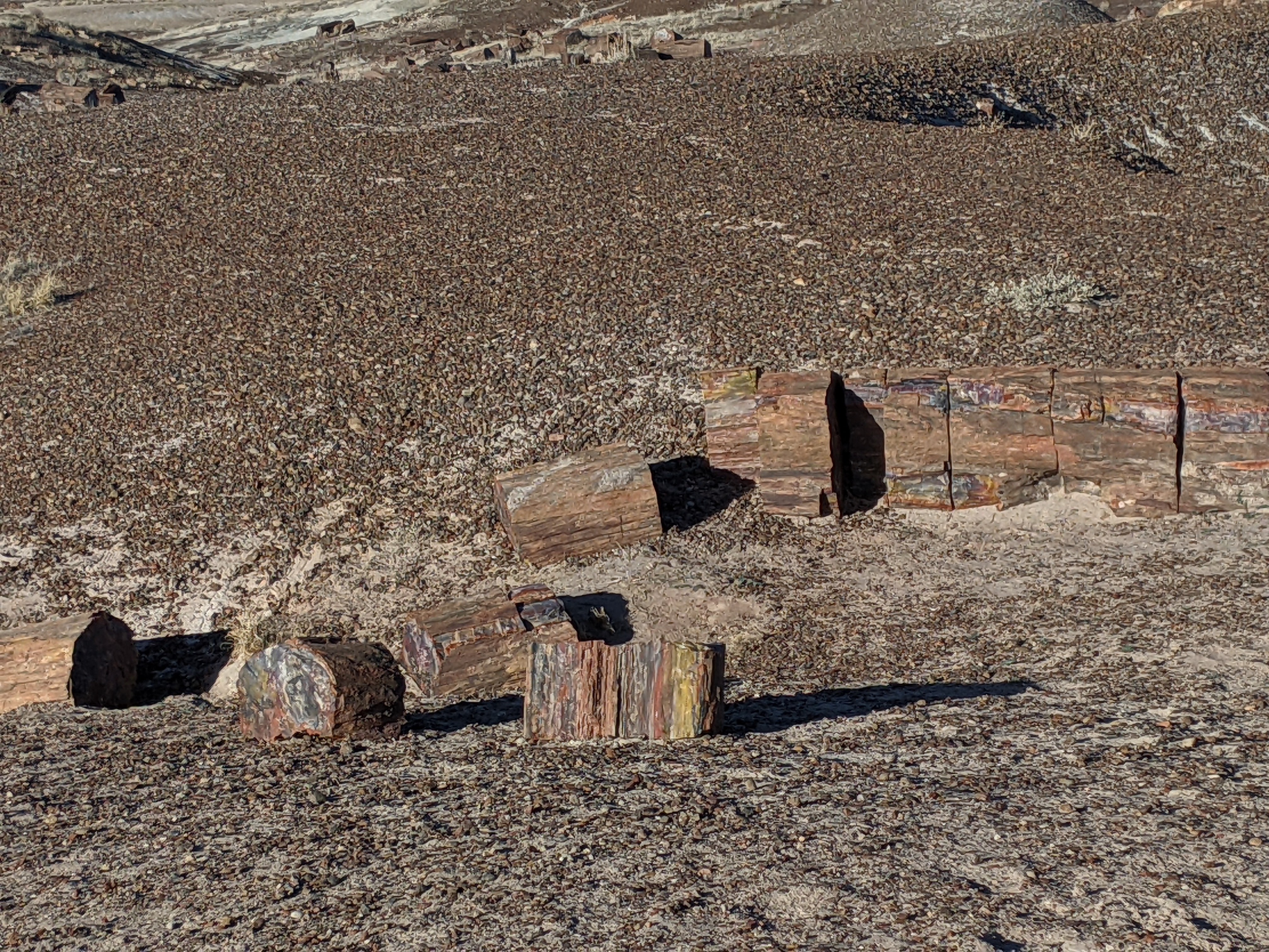 Fun Fact: The wood seen here is over 200 million years old. The logs were washed into a river where they were covered with so much water and sediments that oxygen was cut completely, slowing their process of decay. The quartz within these petrified logs is so easily broken that they broke off into chunks, as if they were cut by a chainsaw. This info is found here if you want to research further. https://www.nps.gov/pefo/learn/nature/petrified-wood.htm