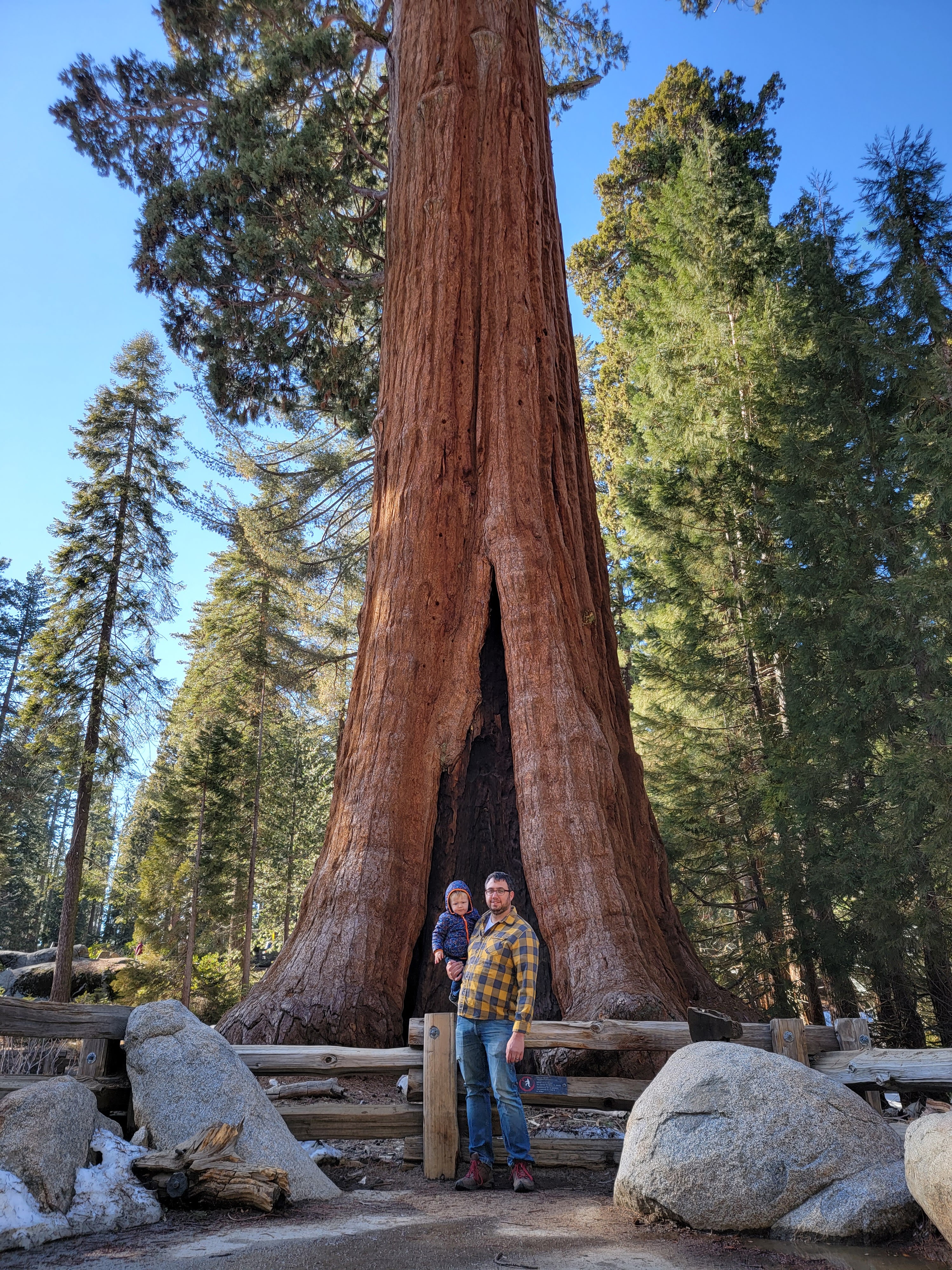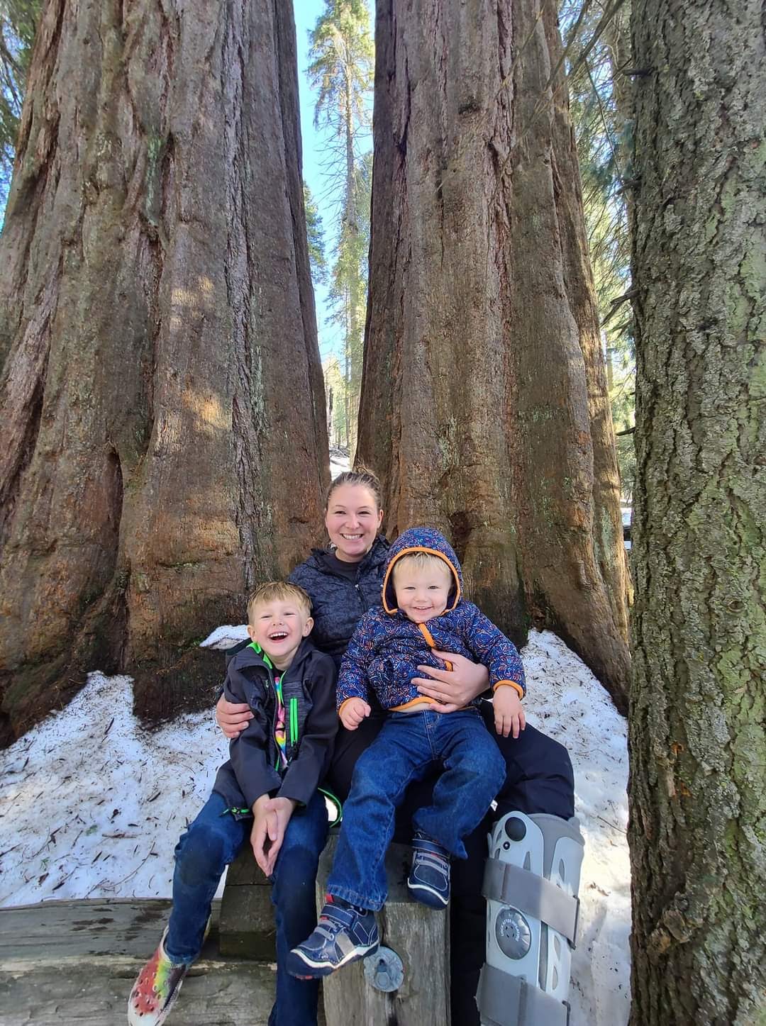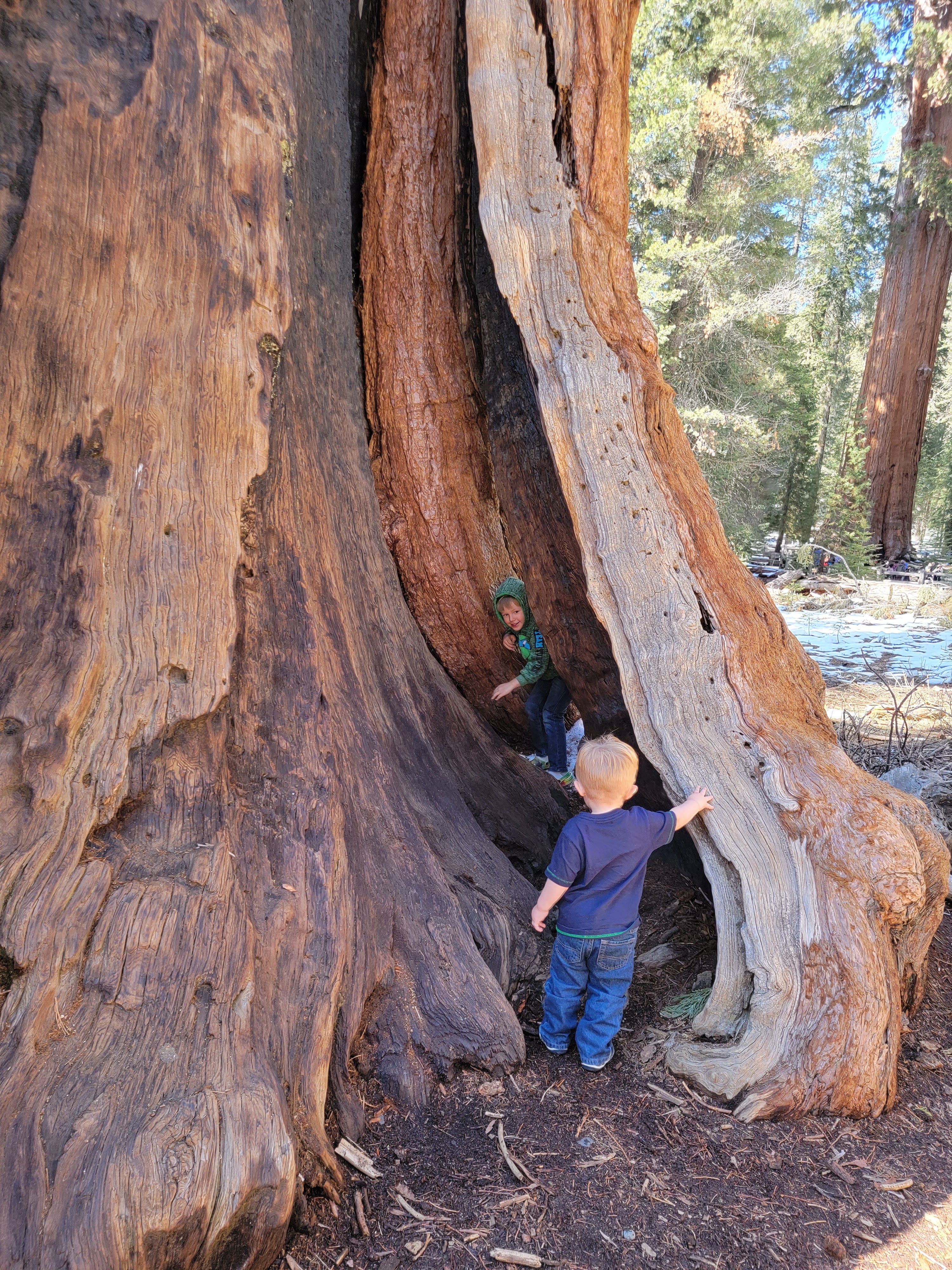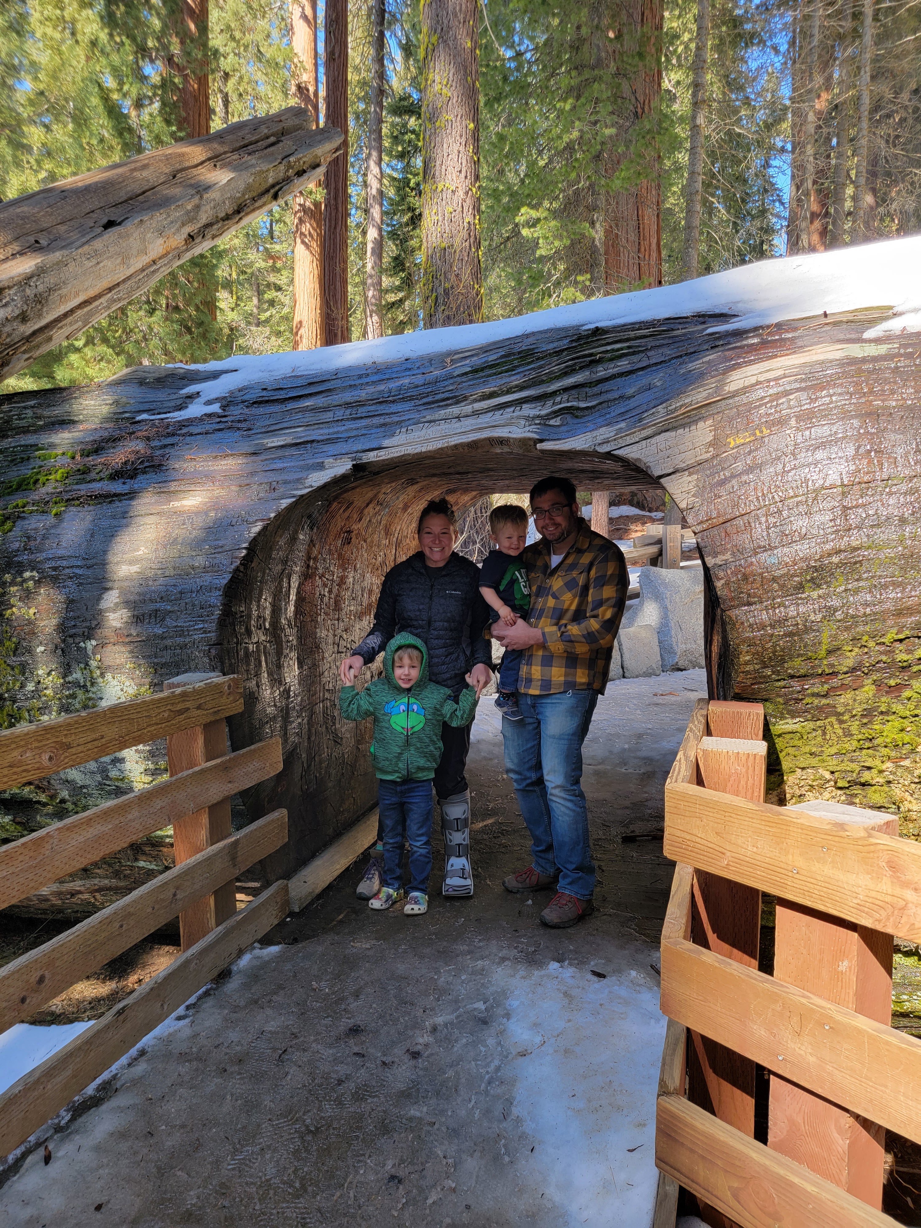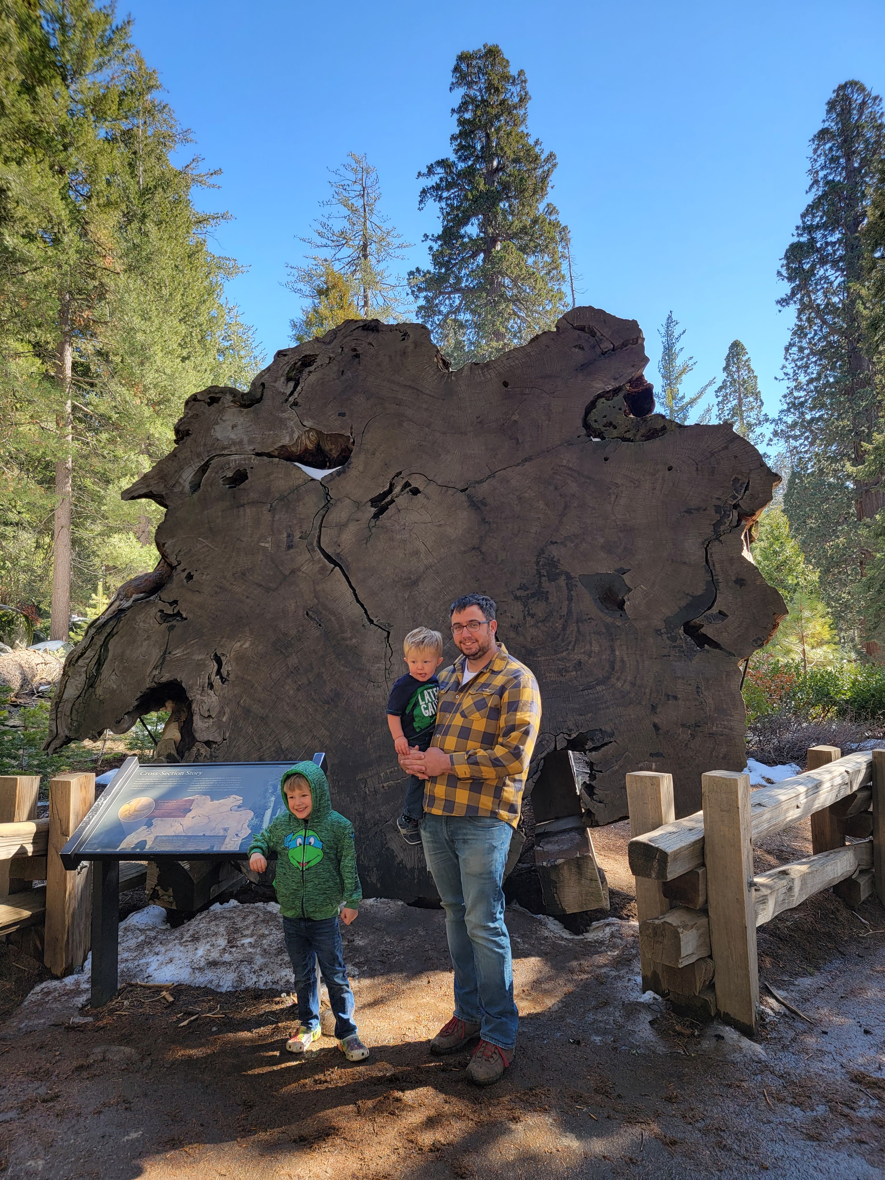 The most sought after destination in the Sequoia National Park is the General Sherman Tree, seen in the photo where I am holding my arms out for measurement. The boys crawled in and out of the tree and are now able to say they have been inside the largest tree on earth. The photo of my husband standing with both boys is in front of a cross section of one of the large sequoia’s. For reference, my husband is 6ft and did not even reach the middle of the cross-section….
