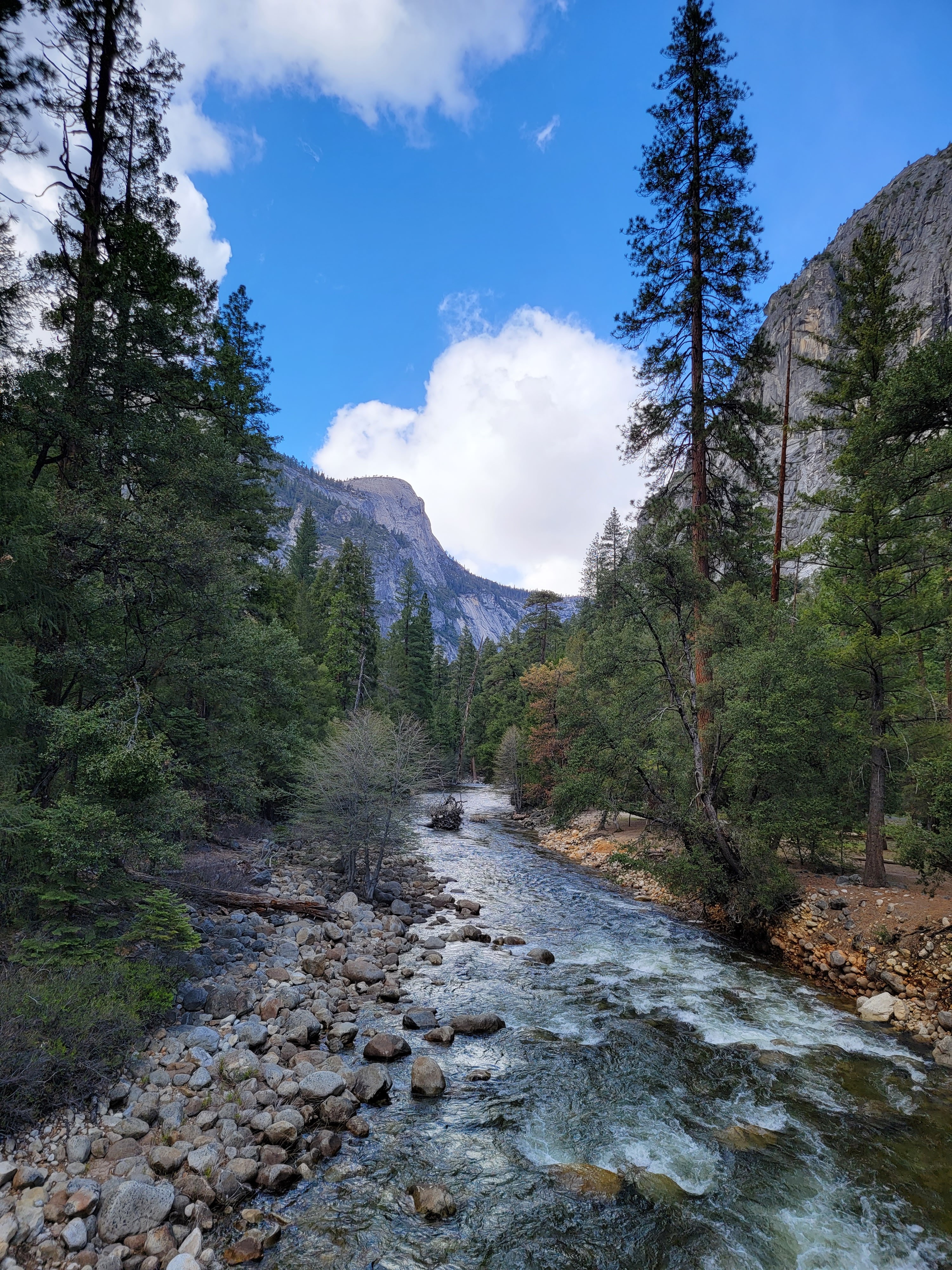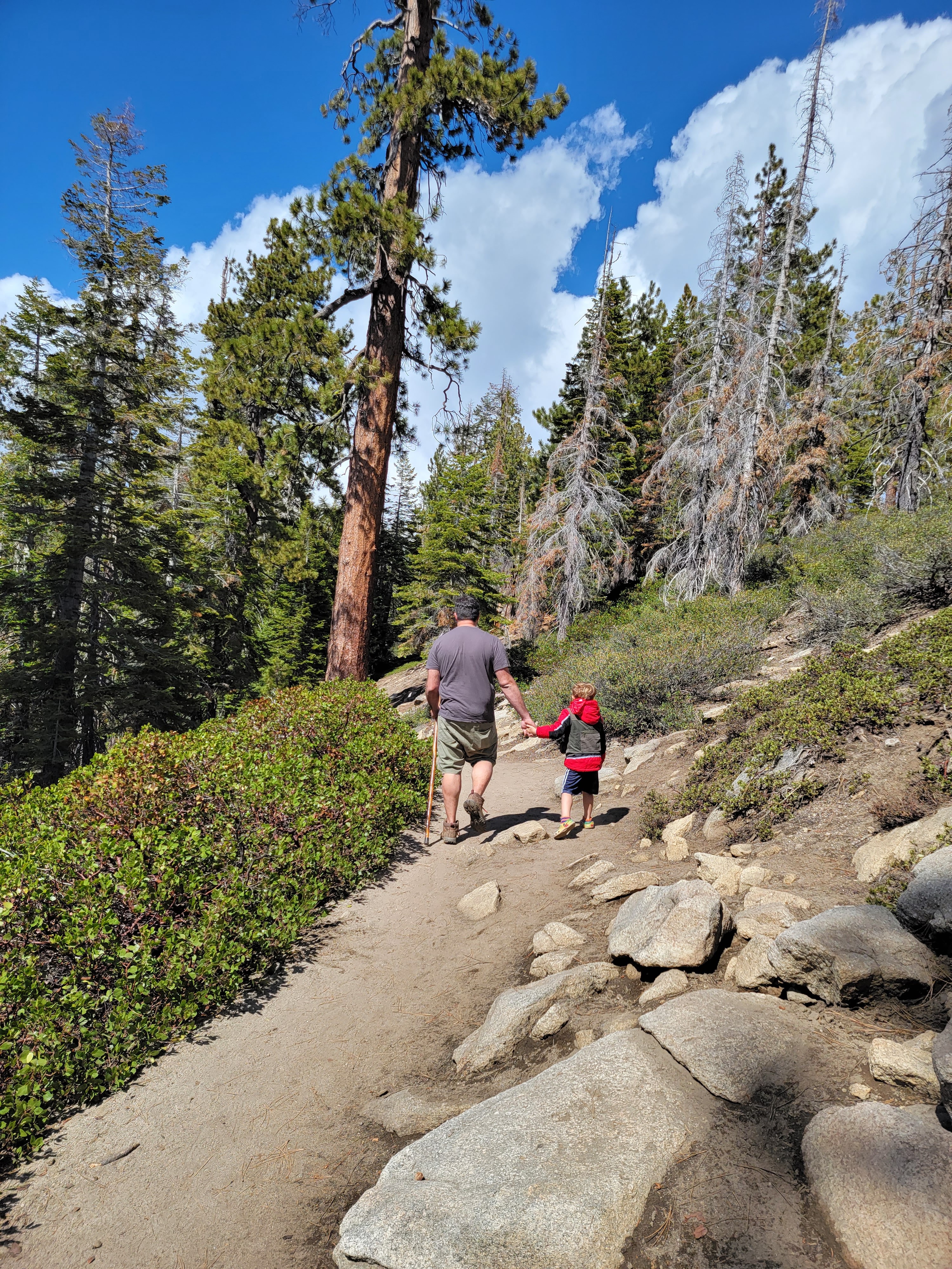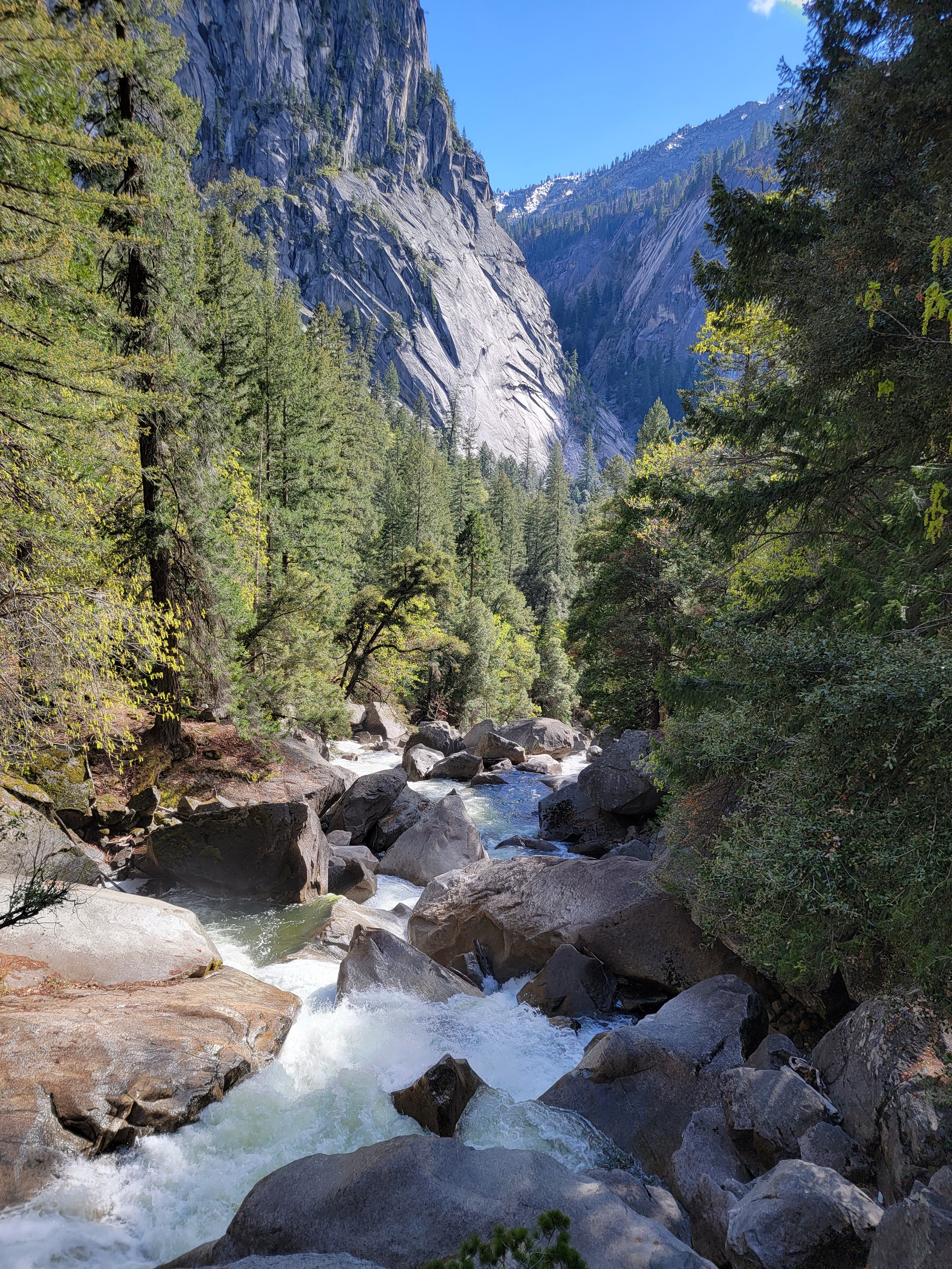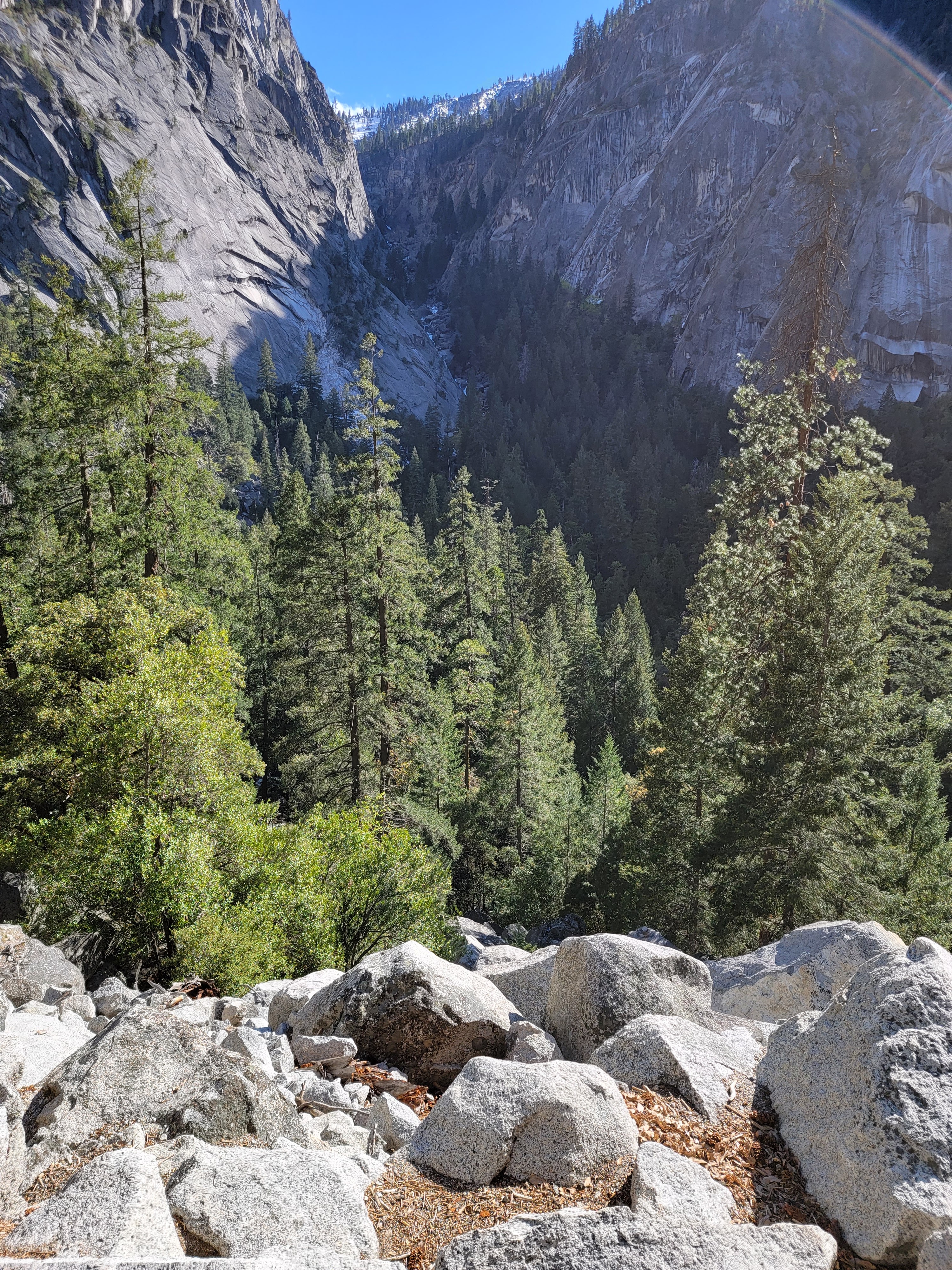 The Vernal Falls trail is absolutely breathtaking and I highly recommend taking this if you are an adult looking to hike without kids or if you feel comfortable hiking inclines with children in carrier. I hiked it with my 30 lb one year old on my back and it was not for the faint of heart. The entire distance to the lower falls is straight uphill, the return is downhill. The elevation change and extreme incline make this trail the most difficult we attempted. Our 4-year-old hiked it independently with several meltdowns, but he did it! Once you reach the lower falls (the bridge), you have a choice to continue to the top for a better view. I was told to avoid doing the top with children as there are many steps that are consistently sprayed from the waterfall and are slippery to all, but particularly young kids. The bottom of the fall was enough for us! You get a small view of the falls with great views of boulders and the water rushing through. One thing we greatly enjoyed about this trail was the amazing views on the way to the falls as you can see below.