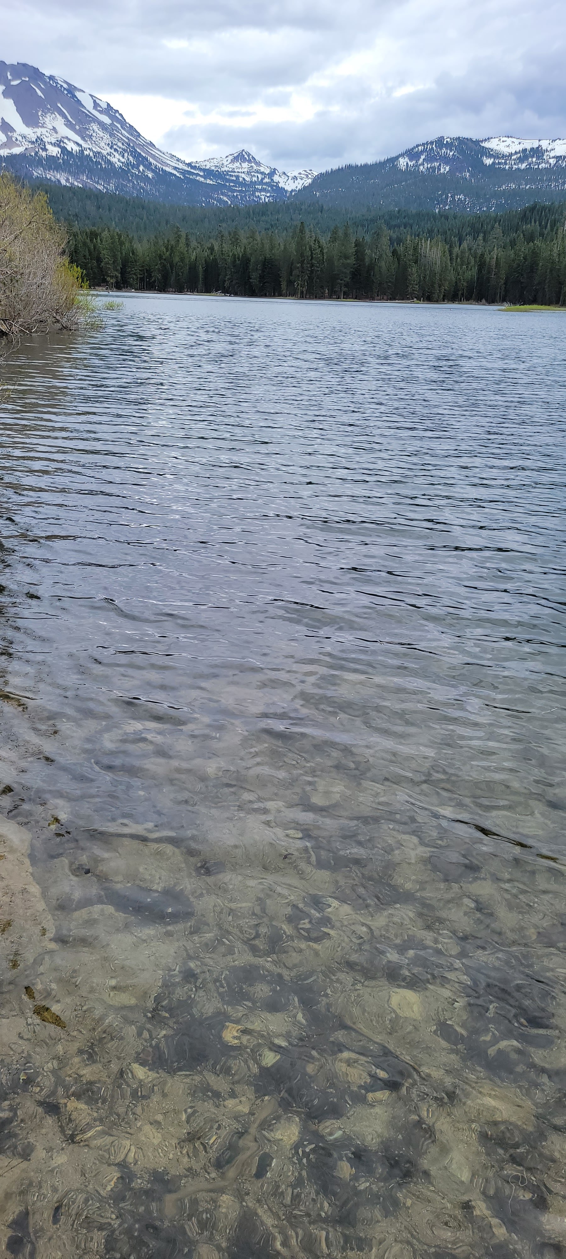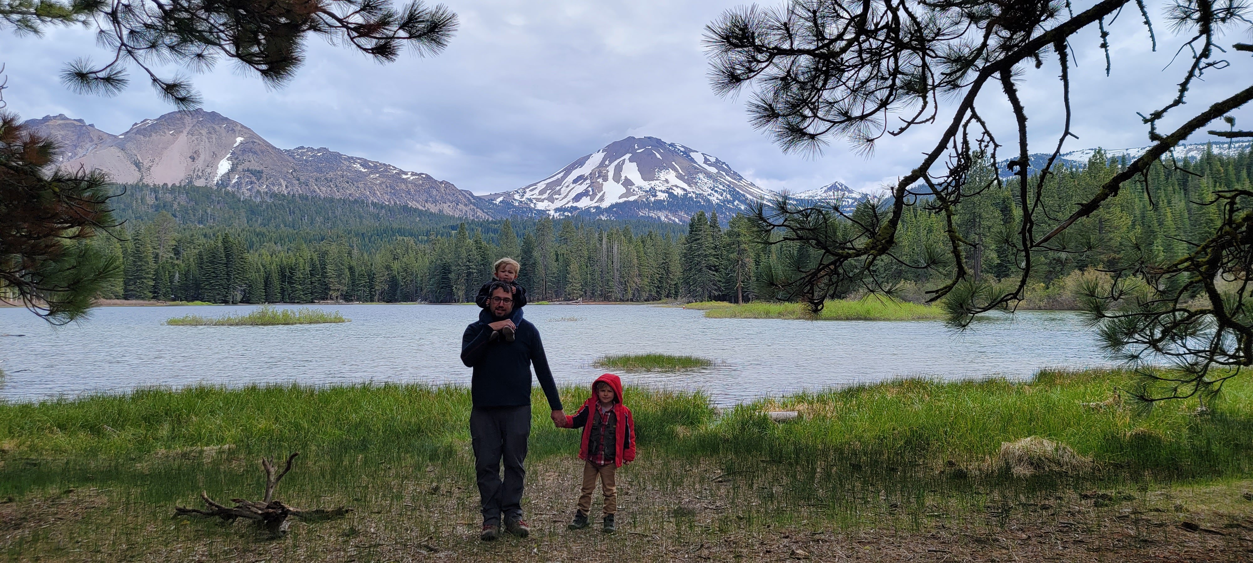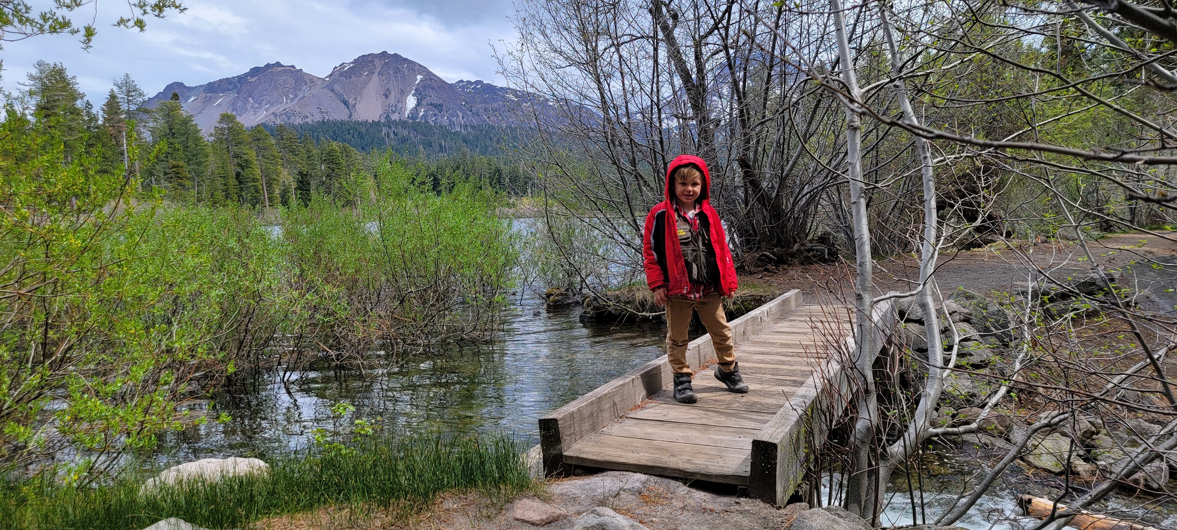 We took the Manzanita Lake trail which was a 1.8 mile loop and perfect for viewing the snowy peaks. The boys were pretty bored this trip, apparently the views weren’t quite as thrilling as they had hoped. However, the bridge and a log made into a bench provided at least a little entertainment towards the end of the loop. The boys much prefer the occasional stump or log to jump on, kudos to Lassen for keeping their trails impeccable, much to my bored boys’ dismay. The lake was so tranquil and crystal clear that I imagine on a clearer day the sky’s reflection in the glass. It’s the perfect trail to walk alone to contemplate life with it’s quiet pine needle softened path. However, we had some wild minions with us who did no such reflection… in fact they were having a day of tantrums…